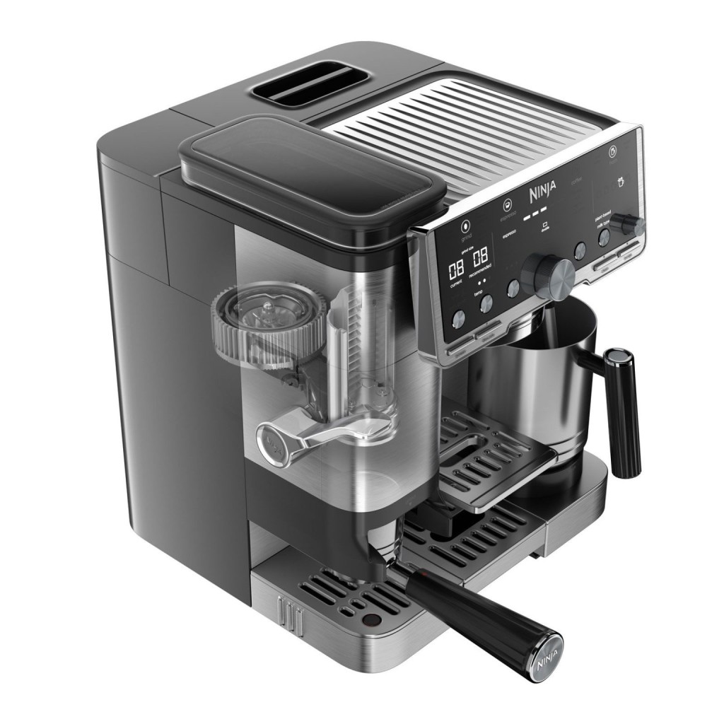 اسپرسوساز تمام اتوماتیک نینجا مدل ES701 با ظاهر بسیار شیک و جدید به رنگ نقره ای/مشکی مناسب آشپزخانه‌ های مدرن امروزی طراحی شده و جلوه منحصر به فردی به فضا می بخشد. برای بررسی جزئیات ظاهری نمای جلویی بدنه را به سه بخش تقسیم می کنیم. در قسمت بالا صفحه نمایشگر جذاب و بصری با چندین دکمه طراحی شده که دسترسی آسان به تنظیمات کاربری را فراهم کرده است.