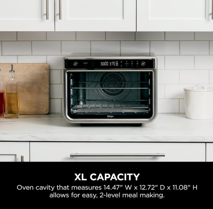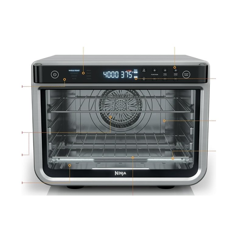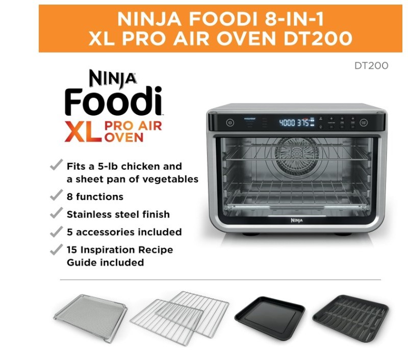 فر برقی نینجا مدل DT200 از نوع فر برقی رومیزی شرکت نینجا با توان مصرفی ۲۴۰۰ وات و با ظرفیت ۲۹ لیتر می باشد رنگ بندی فر برقی نینجا مدل DT200 مشکی و استیل می باشد مخزن فر برقی نینجا مدل DT200 شامل یک سبد سرخ کردنی باظرفیت ۱.۸ کیلوگرم، یک قفسه پیتزای ۱۲ اینچی، با یک قفسه کباب با ظرفیت یک بوقلمون ۵.۵ کیلوگرمی می باشد .