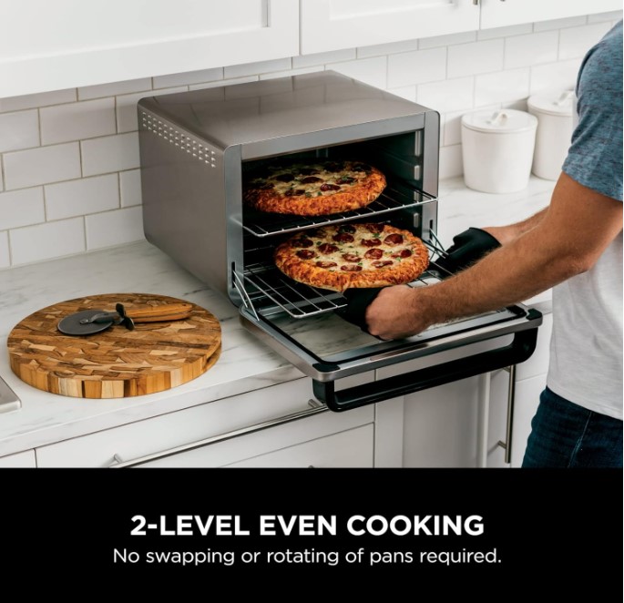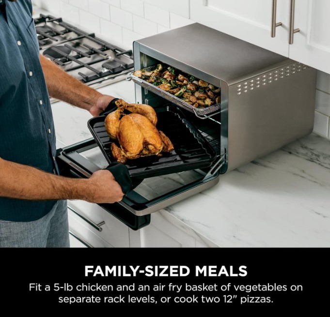 اجاق گاز همراه با ۲ قفسه سیمی (هر یک با پیتزای ۱۲ اینچی)، یک سینی فر، سینی برشته و یک سبد سرخ کردنی هوا (با گنجایش حداکثر ۱.۸ کیلوگرم مواد) همراه است.