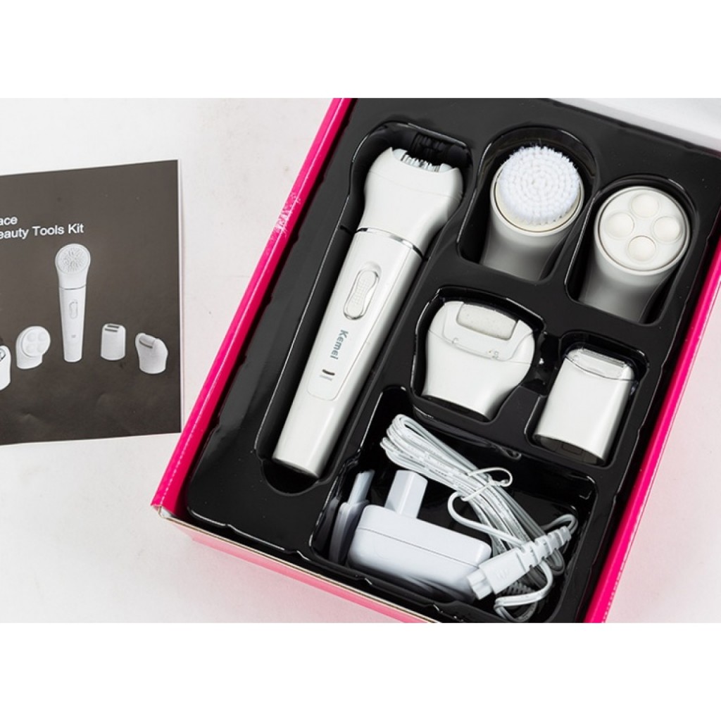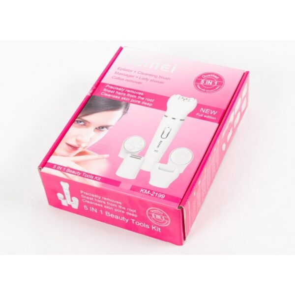 اپیلاتور ۵ کاره کیمی مدل KM-2199 کاره که دارای ۵ سری مختلف که هر کدام مخصوص یک کار می باشد سری اولیه که نصب بر روی خود دستگاه می باشد برای پاکسازی و از بین بردن موهای کل بدن می باشد و سری فرچه ای یکی دیگر از سری های این دستگاه می باشد برای پاکسازی کل پوست مخصوصا قسمت های ارایش شده و سری ماساژور برای ماساژ کل بدن و صورت فراهم شده است و سری دیگر برای اصلاح مو ابرو و خط زنی می باشد و یکی دیگر از سری ها مخصوص سوهان پا یا همان سنگ پای قدیمی خودمان نام بره میشود و به عنوان از بین برنده پوست های مرده بدن استفاده میشود.