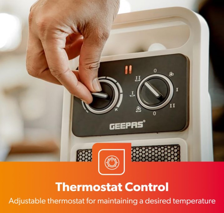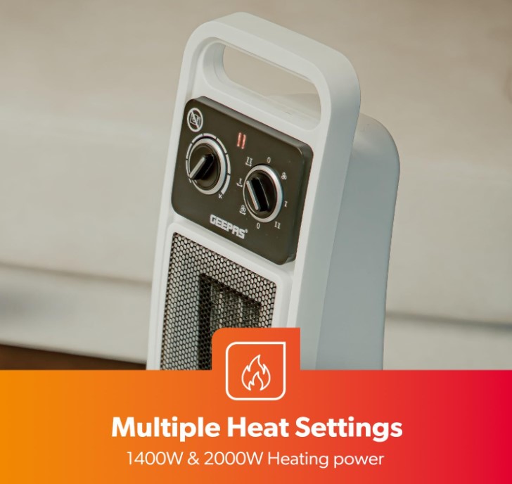 فن هیتر Geepas PTC با یک المنت گرمایشی سرامیکی کم مصرف، این بخاری فضایی دارای ۲ تنظیم، حرارت بالا (۲۰۰۰ وات) و حرارت کم (۱۴۰۰ وات)، به علاوه گزینه ای فقط فن برای از بین بردن سریع نقاط سرد در میز، دفتر، اتاق شما است. ، و خانه فناوری گرمایش سرامیکی پیشرفته PTC همراه با فن فوق کارآمد هر فضا را سریعتر گرم می کند و گرما را به طور یکنواخت توزیع می کند. فقط بخاری قابل حمل خود را روشن کنید، از گرمای خانه، اداره، دسکتاپ و داخل خانه لذت خواهید برد.