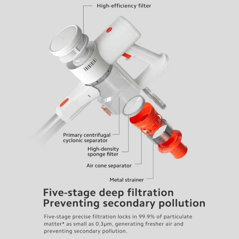 فیلتر با کارایی بالا که قادر است ذرات بسیار ریز تا اندازه ۰.۳ میکرو متر را حبس کند و از ورود آن ها به هوای بازگشتی جلوگیری می کند.xiaomi vacuum cleaner G20 lite مجهز به فناوری تشخیص گرد و غبار با نور سفید است که به شناسایی کثیفی های پنهان کمک می کند، به این ترتیب اثربخشی تمیزکاری آن بر روی سطوح مختلف بهبود می یابد.جارو دارای یک باتری داخلی با ظرفیت ۲۲۰۰ میلی آمپر ساعت است که این امکان را به شما می دهد برای مدت زمان طولانی تر بدون نگرانی از تمام شدن شارژ، از قدرت مکش پایدار بهره مند شوید.