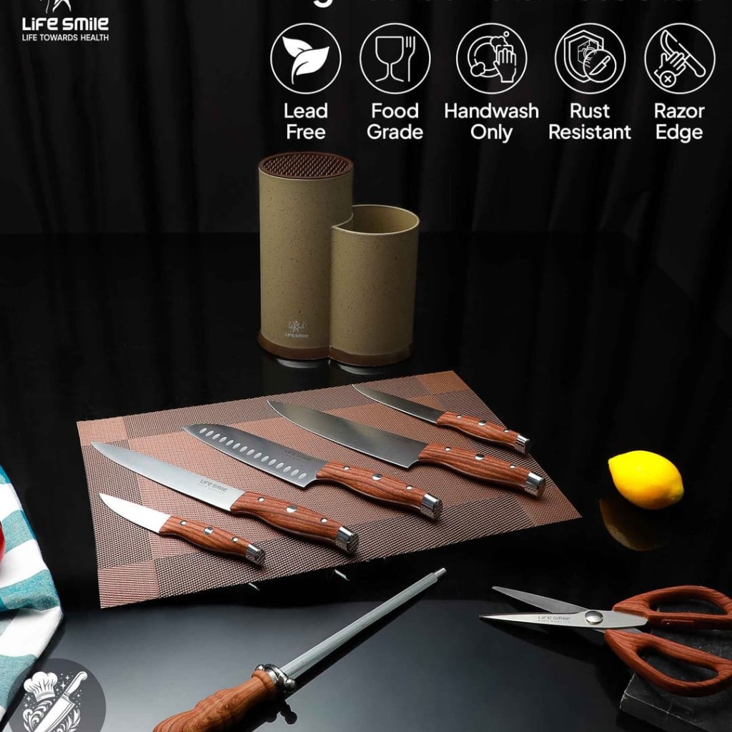 ست چاقو شامل: چاقوی سرآشپز، چاقوی سانتوکو، چاقوی برش، چاقوی همه کاره، چاقوی پوستکن، قیچی، تیزکن، پایه چاقو