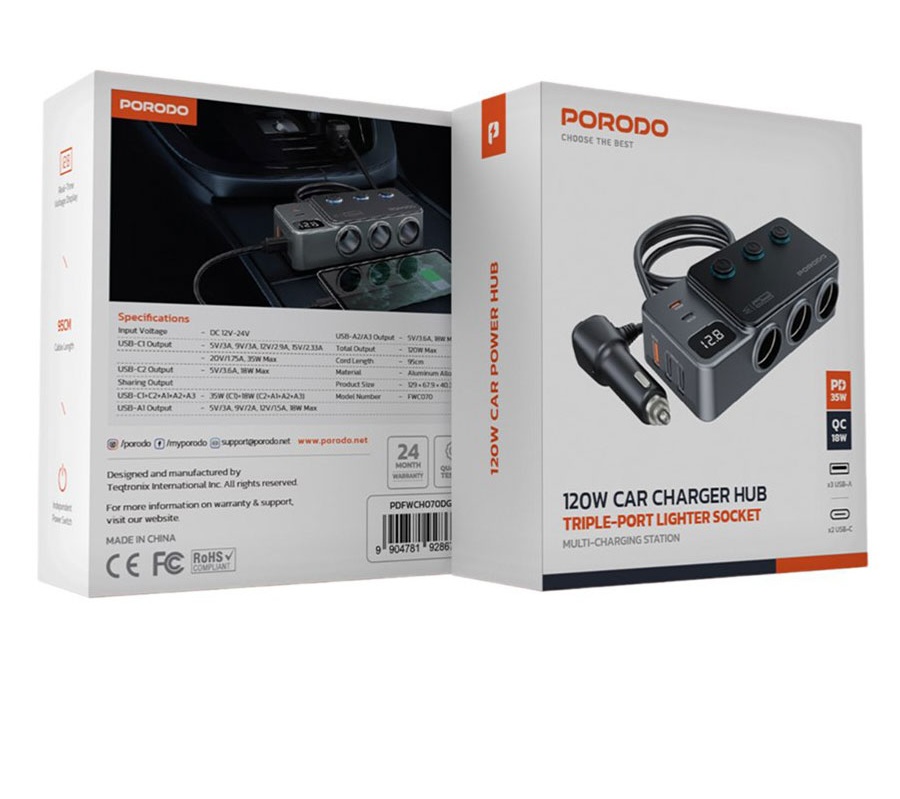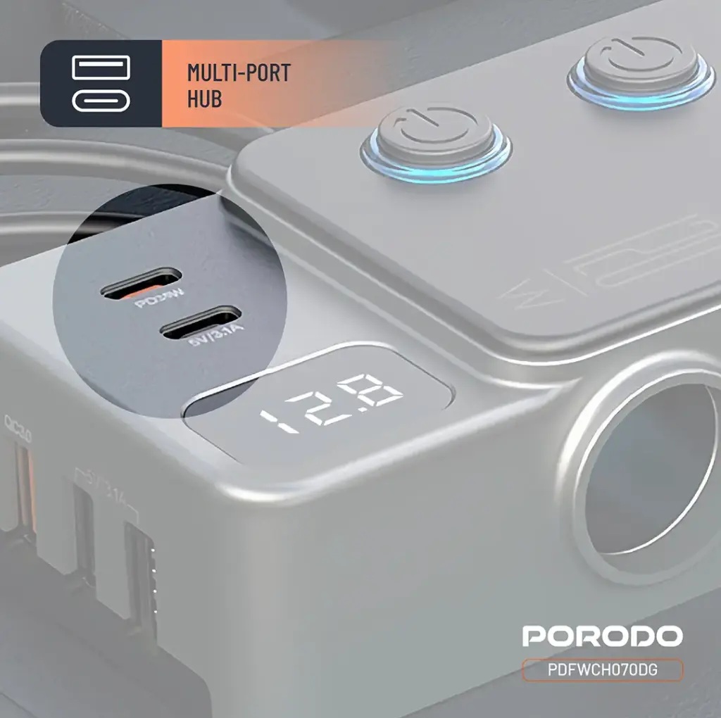 شارژر فندکی خودرو 120 وات پرودو مدلPorodo 120W Car Charger Hub Triple-Port Lighter Socket PDFWCH070