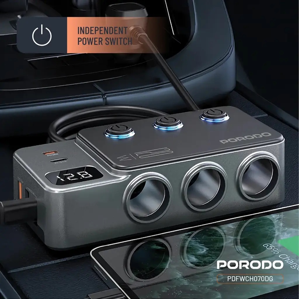 شارژر فندکی خودرو ۱۲۰ وات پرودو مدلPorodo 120W Car Charger Hub Triple-Port Lighter Socket PDFWCH070