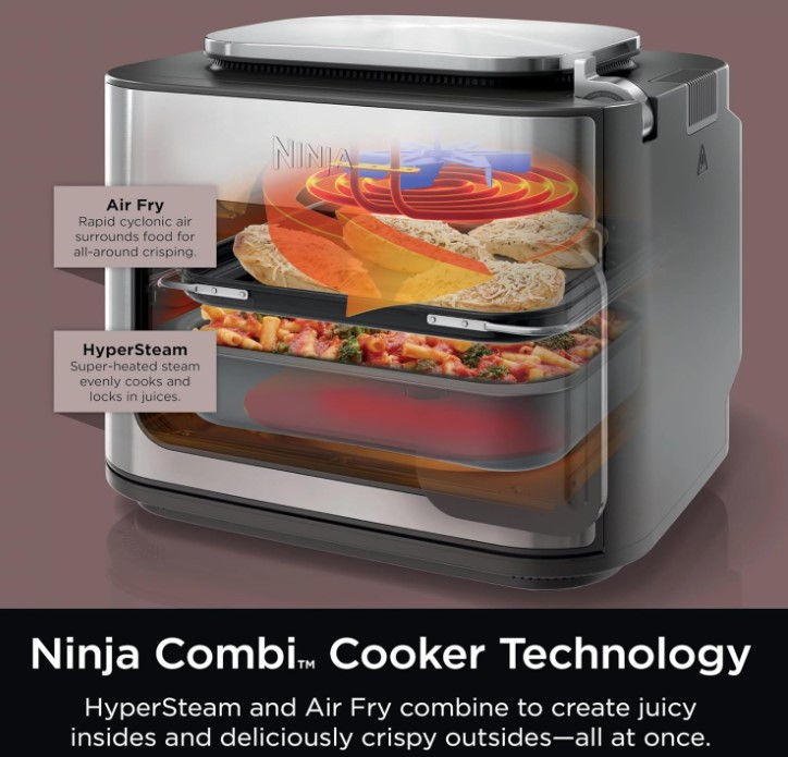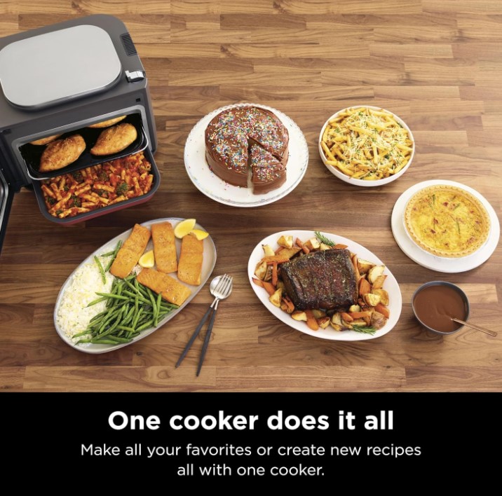 فر و مولتی کوکر رومیزی نینجا مدل SFP700 مجهز به فناوری combi cooker بوده که با داشتن المنت در بالا و پایین گردش حرارت داغ به شما امکان طبخ دو مدل غذای مختلف بصورت همزمان را می دهد و در طبقه پایین غذای کبابی آبدار و طبقه بالا غذای ترد و چیبسی را درست می کند. از پخت برنج گرفته تا پاستا، پیتزا، کیک، کاپ کیک، شیرینی، انواع کوکوها، مرغ شکم پر، ماهی و میگو سوخاری، جوجه، استیک گوشت، کباب کردن سبزیجات و گوشت، تنها موارد محدودی از عملکردهای کمبی نینجا sfp700 می باشد.