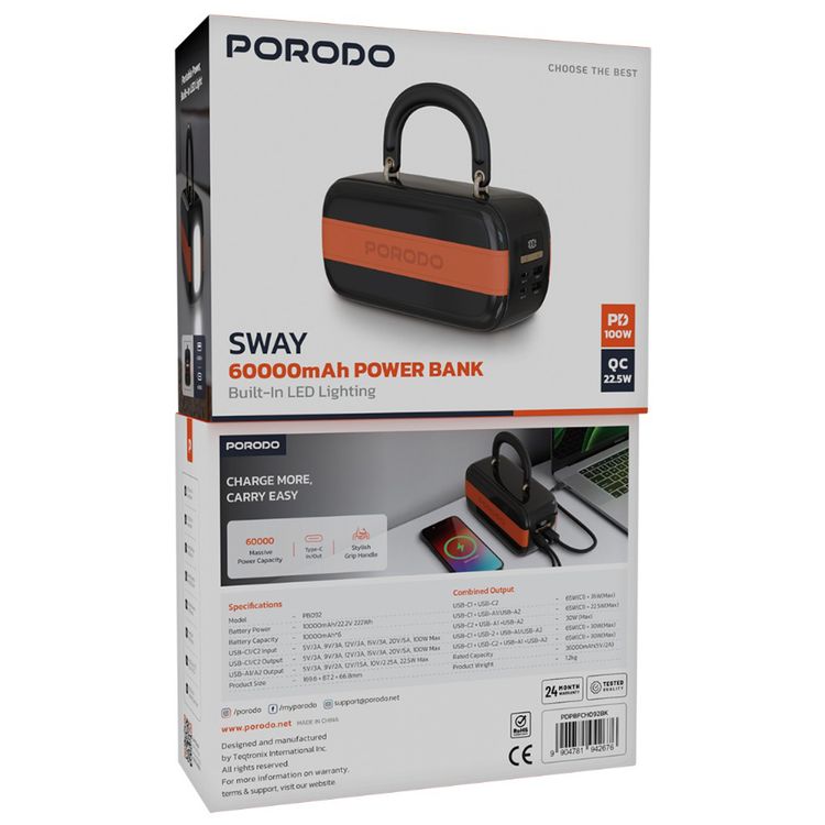 پاوربانک Porodo Sway 60000mAh یک راهحل همهجانبه، سریع و قابلاعتماد برای هر فردی است که در دنیای متکی به انرژی، به یک منبع شارژ پایدار و قدرتمند نیاز دارد